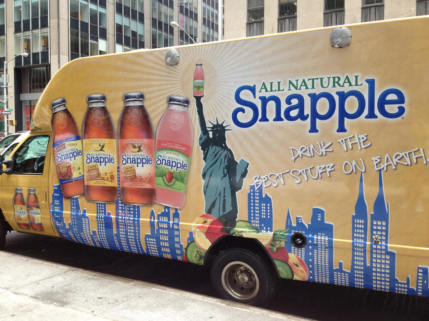 Welcome to the (SNAPPLE JUICE®) vehicle advertisement program.We are currently seeking to employ individual's Nationawide, Regular citizens, Professional drivers to go about their normal routine as they usually do, only with a big advert for "SNAPPLE JUICE" Plastered on your Bike/Car/Truck/Boat/Lorry/Cart's exterior surface. What does the company get out of this type of ad strategy? We get lots of exposure and awareness from doing this. The adverts tend to be colorful, eye-catching and attract lots of attention which people who are stuck in traffic can't avoid seeing the wrappedBike/Car/Truck/Boat/Lorry/Cart alongside them.